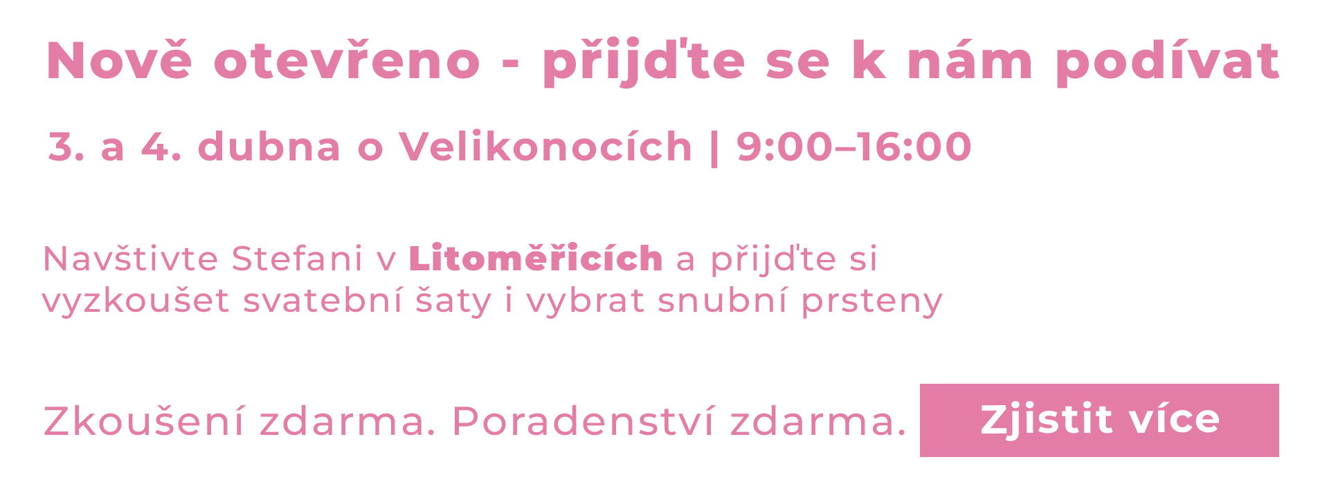 Francouzské svatební šaty (koupě i půjčení) v Litoměřicích, snubní a zásnubní prsteny ze zlata i stříbra, dekorace a doplňky. Výhodné balíčky pro nevěsty 2026 vše na jednom místě.