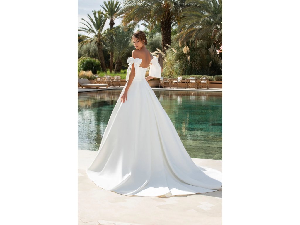Široká sukně v zadní části přechází do vlečky, která působí slavnostně a na fotografiích vynikne. Po focení můžete vlečku prakticky připnout, aby vám při pohybu nepřekážela.
