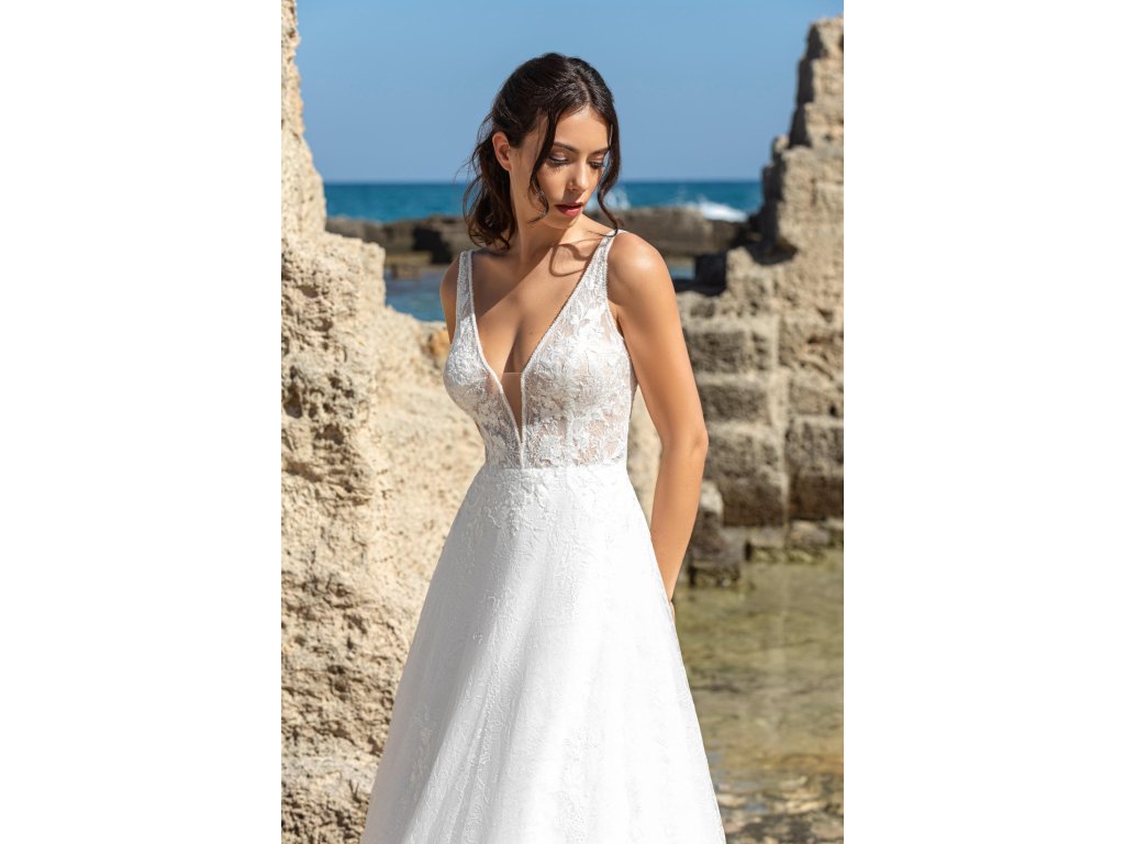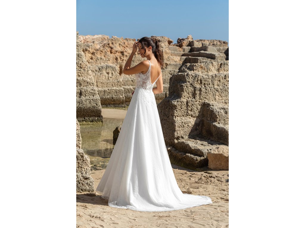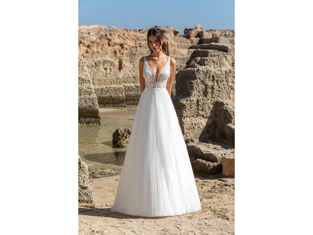 Šaty jsou ušité v A linii a mají čistý, jednoduchý vzhled, který krásně vynikne na letní svatbě i při formálnějším obřadu. Díky lehkému provedení působí svěže a nadčasově.