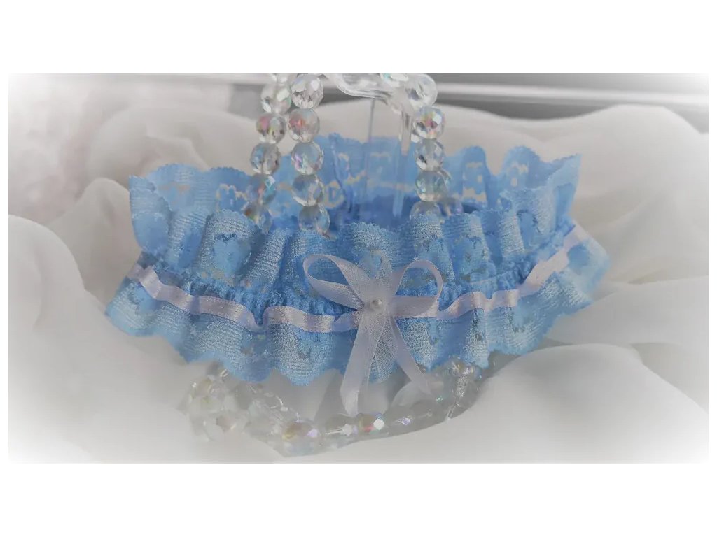 Svatební krajkový podvazek pro nevěstu v modro-bílém provedení, české výroby. Podvazek je na pružné gumičce pro pohodlné nošení, zdobený jemnou mašličkou. Šířka cca 5,5 cm.