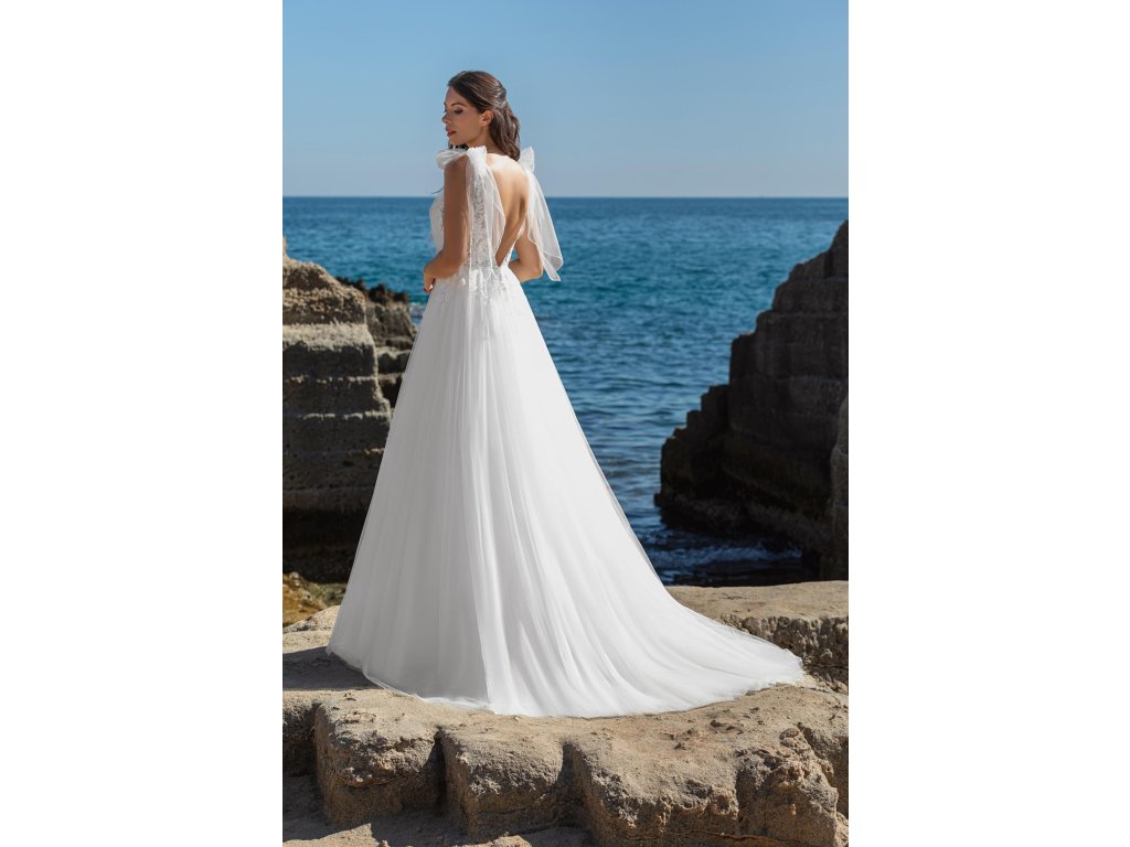 Sukně je z jemného tylu, který šatům dodává vzdušnost a krásný pohyb, a v zadní části přechází do mírné vlečky. Výrazným detailem jsou ramínka s mašlí ze splývavého tylu, která dodá modelu romantický a originální nádech. Pod šaty můžeš zvolit spodnici s jedním kruhem pro výraznější tvar, nebo je nechat bez spodnice pro přirozeně lehký efekt.