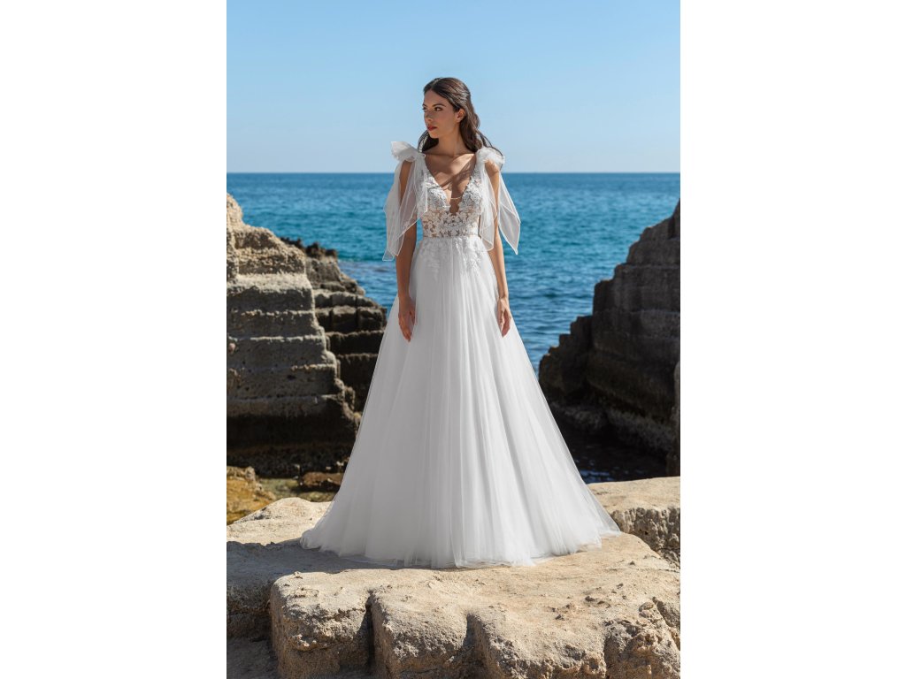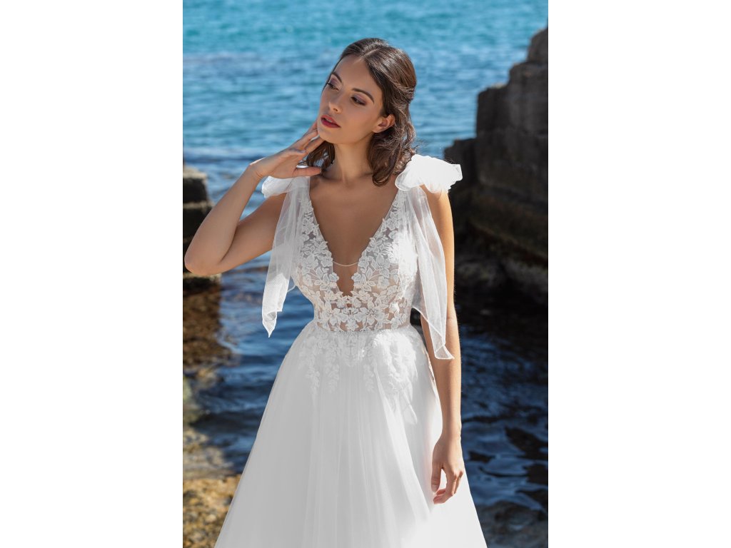 Romantické svatební šaty z francouzské kolekce Just For You jsou jemný, nadýchaný model na ramínka, stvořený pro nevěstu, která chce působit lehce a přirozeně. Šaty mají hluboký výstřih do V v přední části i vzadu, kde krásně vyniknou holá záda. Krajkový živůtek působí elegantně a zároveň velmi ženským dojmem, zapínání je prakticky řešené zipem v pase.